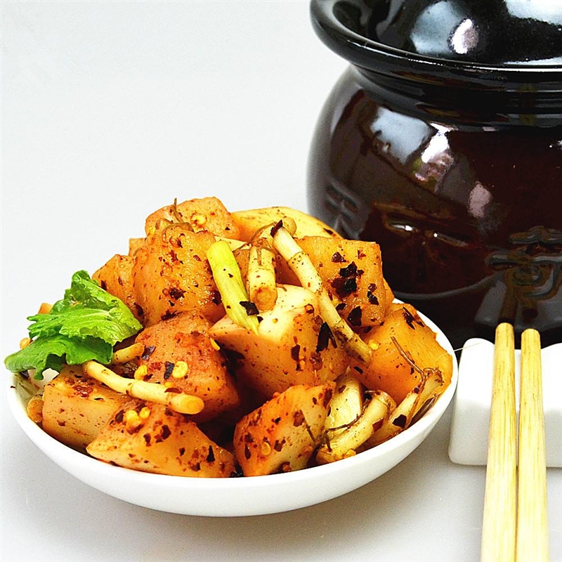 泡菜是銅仁人民日常生活中不可缺少的食物,它不僅制作簡便,原料充足,經(jīng)濟(jì)實(shí)惠,省時省力,便于保存,而且還脆嫩鮮香,花樣多變,清涼爽口,富有營養(yǎng),增進(jìn)食欲,所以深受人們的喜愛。而其中以酸蘿卜為其經(jīng)典之作。泡酸蘿卜主要以蘿卜為原料,浸泡在加有多種調(diào)味料和香料的鹽水中,經(jīng)發(fā)酵制作而成的。蘿卜在鹽水中發(fā)酵,主要是在乳酸菌的作用下進(jìn)行。乳酸菌是利用原料中的糖分發(fā)酵生成,乳酸能抑制有害微生物活動而起到保存泡菜的作用,并使蘿卜產(chǎn)生酸味,清脆涼爽,質(zhì)地清脆,香氣濃郁,成酸甜鮮,稍帶辣味,便于貯存。