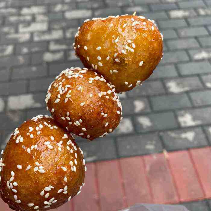 形如雞蛋,色澤紅褐,以芝麻裹面,色香味俱佳。其制作方法以糯米加少量大米打粉,加水揉成面團(tuán),捏成圓狀,放入加有紅糖(或白沙糖)的油鍋里炸制而成。有色鮮香郁、粘糯適中、味甜不膩、外形美觀等特點(diǎn),老少咸宜。